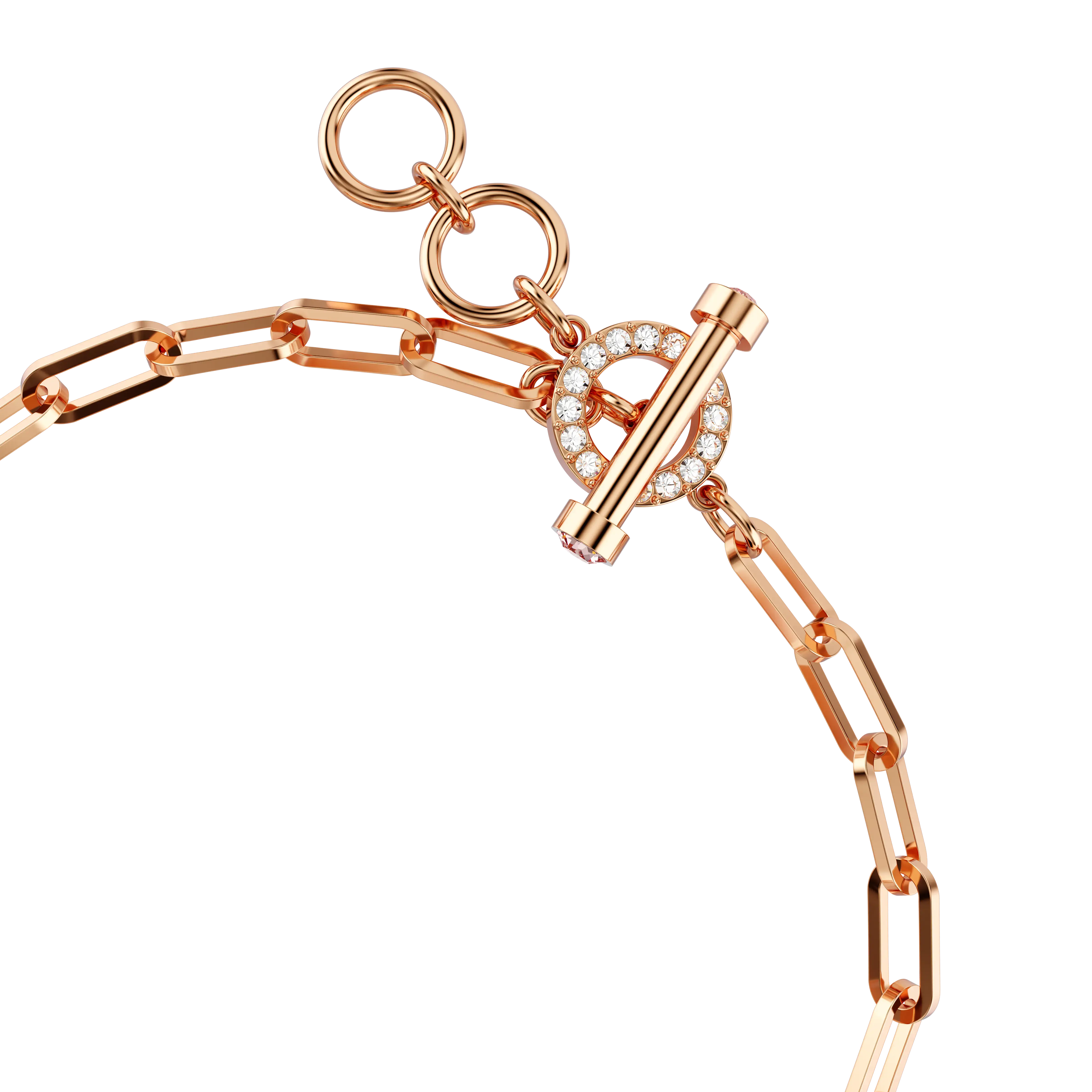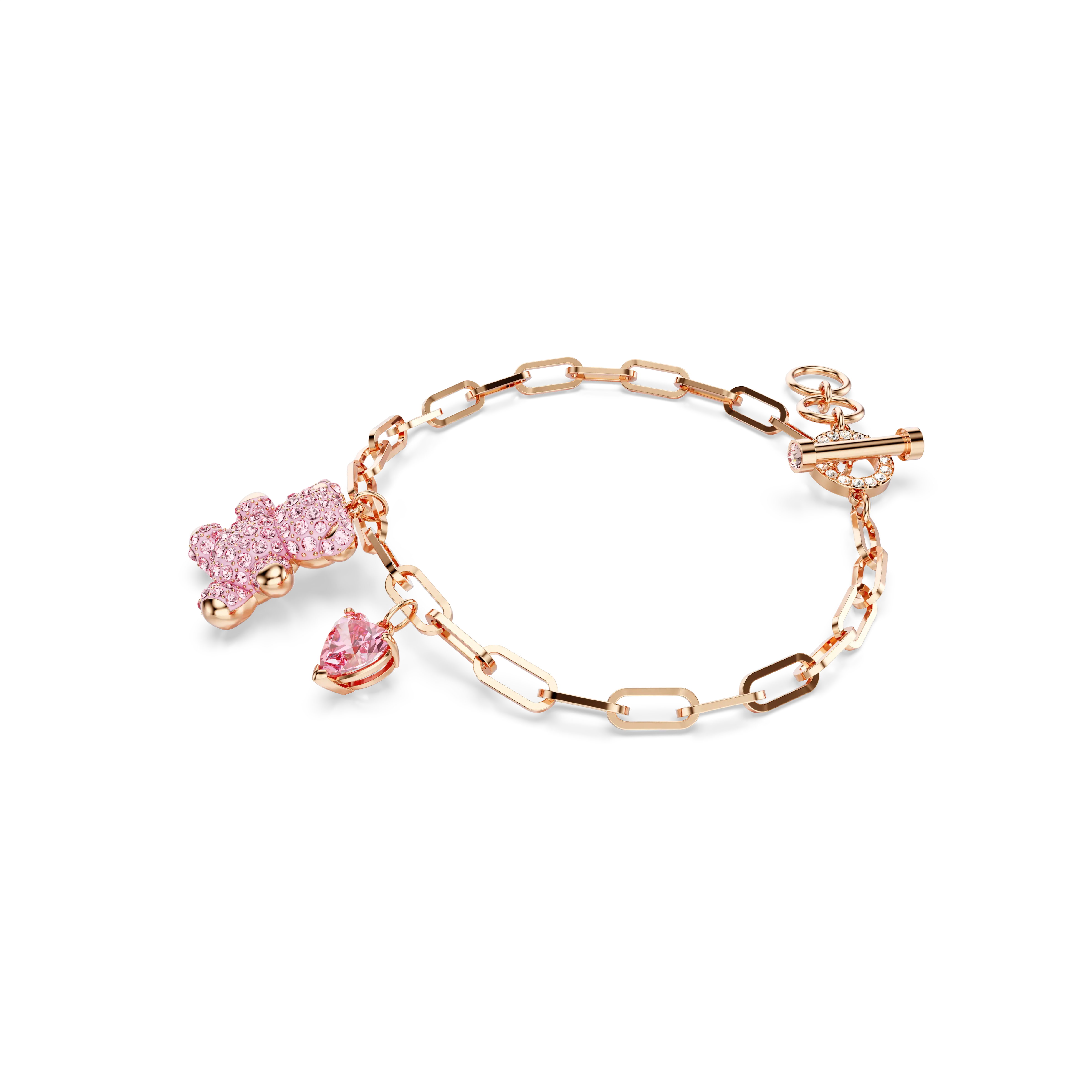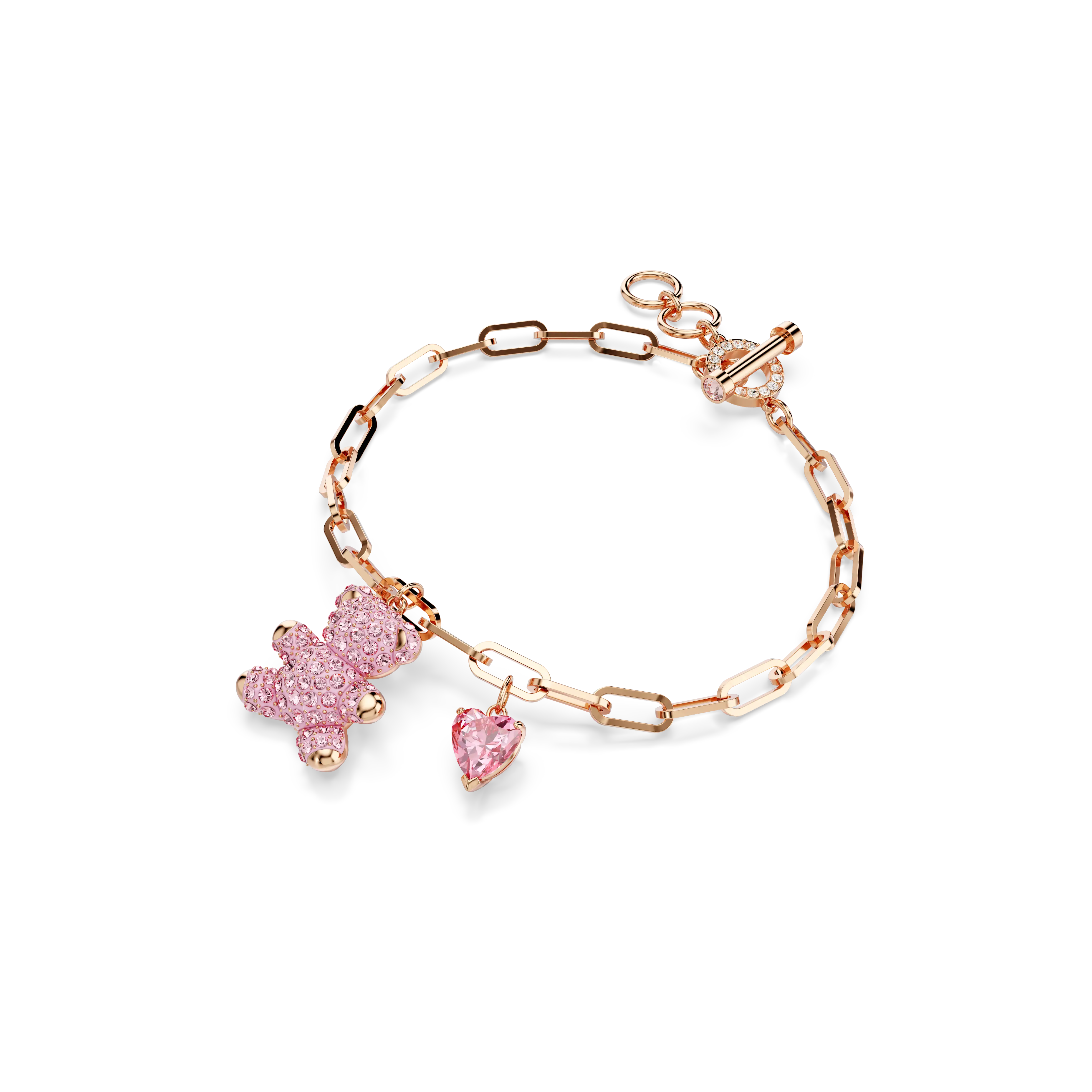 This rose gold-tone plated chain bracelet features a playful teddy bear motif embellished with pink crystal Pointiage®,and a heart-shaped charm in warm pink. Wear yours with the matching necklace to complete the set.