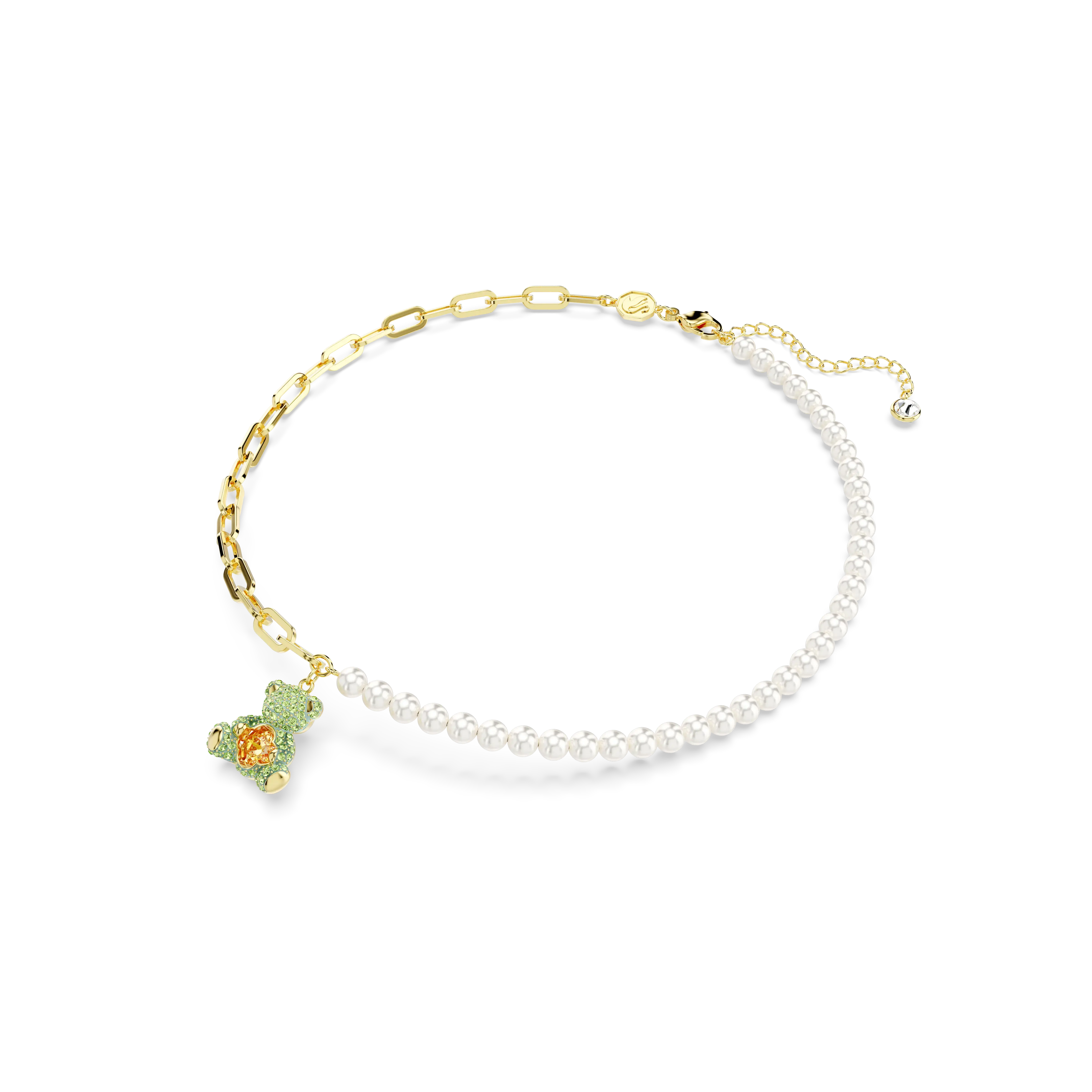 Raise a smile with this playful teddy bear pendant. The heart-warming design is worn on a necklace of Swarovski Crystal Pearls and a gold-tone plated chain with a teddy motif embellished with green crystals. At its center,the teddy holds a yellow Swarovski Zirconia dancing stone that provides constant light-catching motion. Wear yours with a matching bracelet to complete the set.