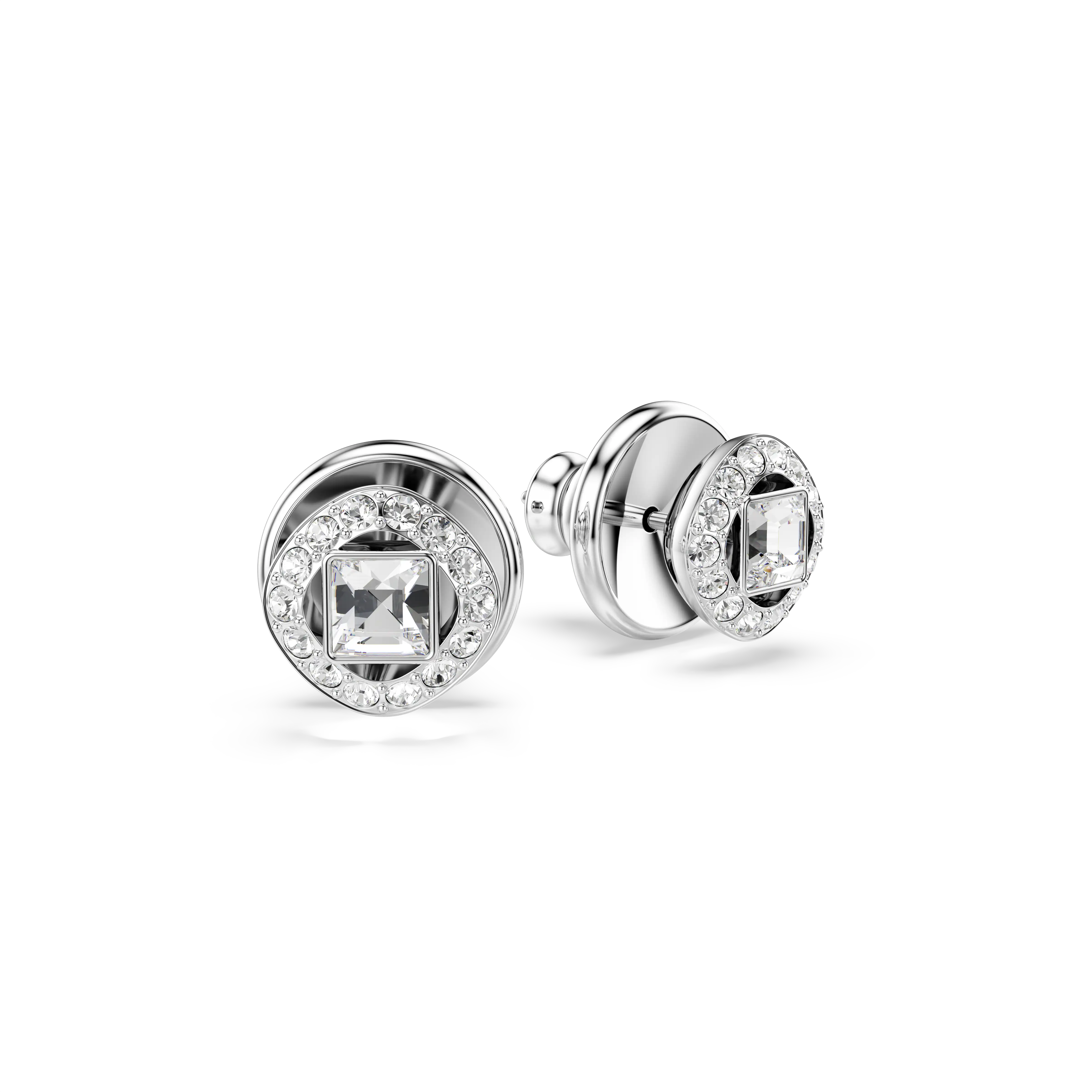 Choose these pierced Swarovski earrings to infuse your style with light. Each rhodium plated stud features a clear square-cut crystal,surrounded by a circle of shimmering pavé. A sublime gift for yourself or a loved one that works for everyday wear or special occasions.