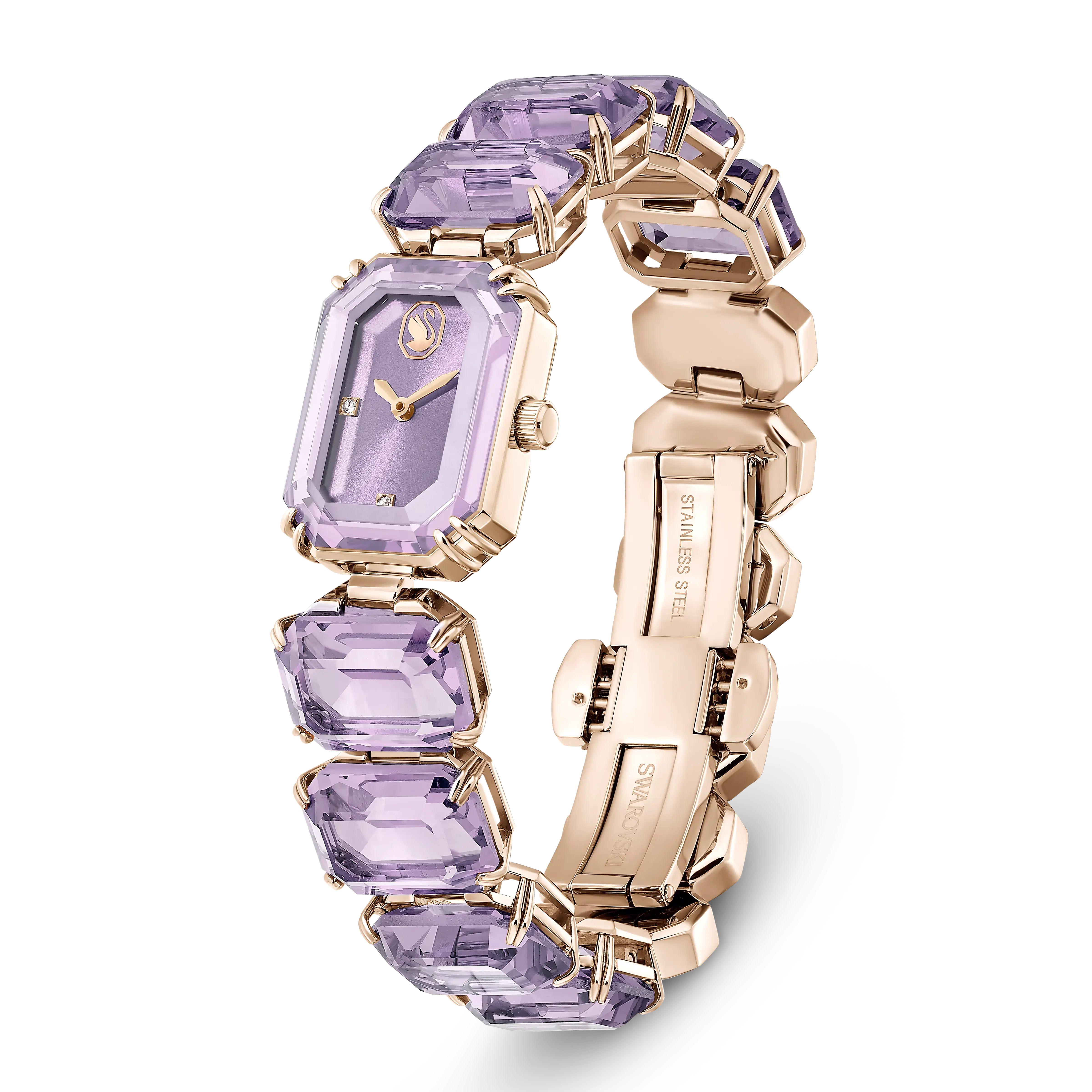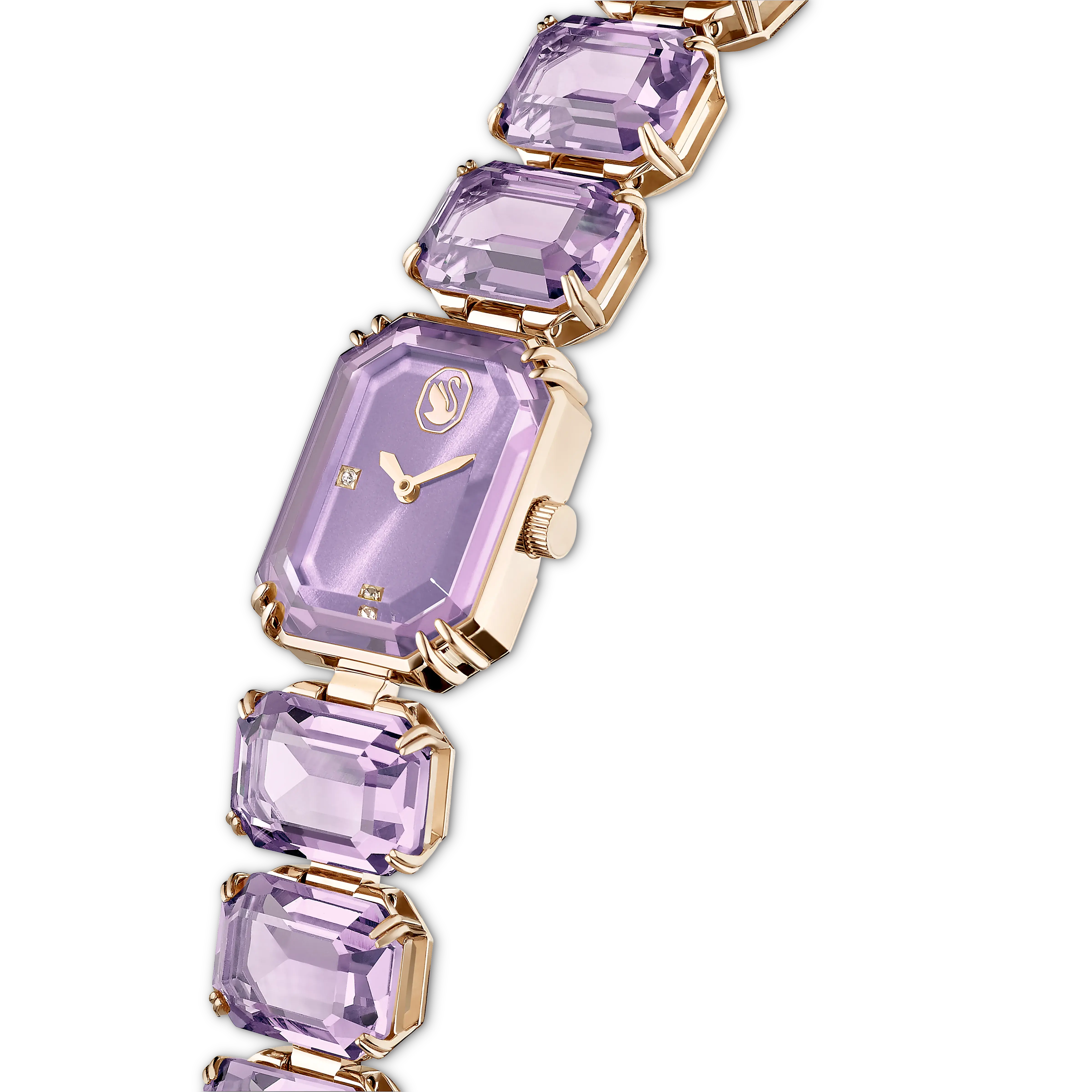 Inspired by the Millenia jewelry family,this candy-colored watch offers sensational wrist appeal. Crafted with a champagne gold-tone finish,the bracelet is expertly crafted with a row of octagon-cut crystals in a purple hue,connecting to an octagon-shape case with a sunray purple dial. Three clear crystals are used for hour markers,along with an additional crystal in the crown,while the Swan logo sits elegantly at 6 o’clock. This Swiss Made watch is water resistant to 50m and offers a playful choice for solo styling or layering.